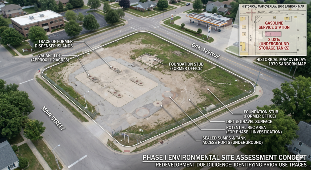 A former dry cleaning operation involves solvents that migrate through soil and groundwater in ways that require significant remediation before a site is developable. Underground storage tanks from former fuel operations carry their own mitigation requirements. Neither shows up on a boundary or topographic survey. Both show up in a Phase I Environmental Site Assessment, the formal instrument that documents a site’s historical use and identifies recognized environmental conditions before you’re committed to addressing them on your dime.